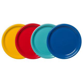 The Fiesta Bistro Coupe 10 1/2 Inch Dinner Plate is now available in a set of four, featuring a mix of Vibrant colors of lapis, turquoise, scarlet, and daffodil that bring a fresh, modern touch to your dining experience. With its higher rim and flatter surface, this plate offers a distinct cafe or bistro style, perfect for showcasing main courses, pasta dishes, loaded salads, and hearty sandwiches. The elevated rim helps contain sauces and dressings, making it ideal for serving saucy dishes like curries or pasta. Designed with Fiesta's signature durability, this versatile set allows you to mix and match colors to create a vibrant, personalized table setting for any occasion.